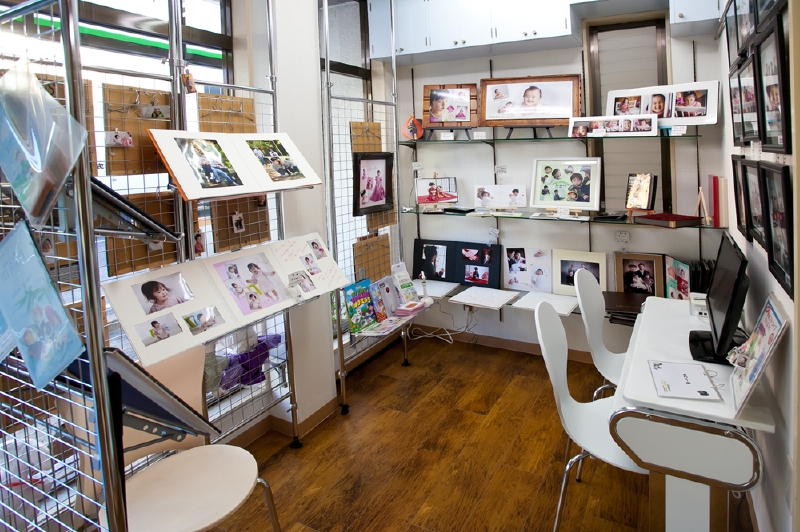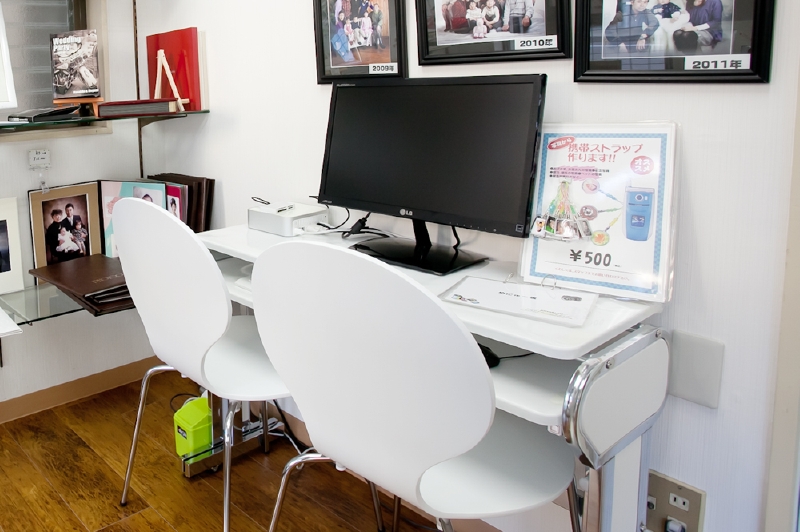 そして、今まで大型プリンターが店頭にありましたが、それも作業場に移し、当店の商品ギャラリーを設けました。ここではギャラリーの他にも、パソコン上でお客様ご自身がご入り用のお写真をお選び頂く事が出来ます。撮影直後にはお選び頂けるのですが、混んでいる場合には後日お願いする場合もありますのでご了承下さい。